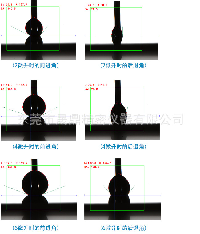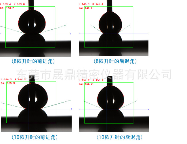 后退角:指液體在已被潤濕過的樣品表面進(jìn)行潤濕鋪展,此時的接觸角叫做樣品的后退角